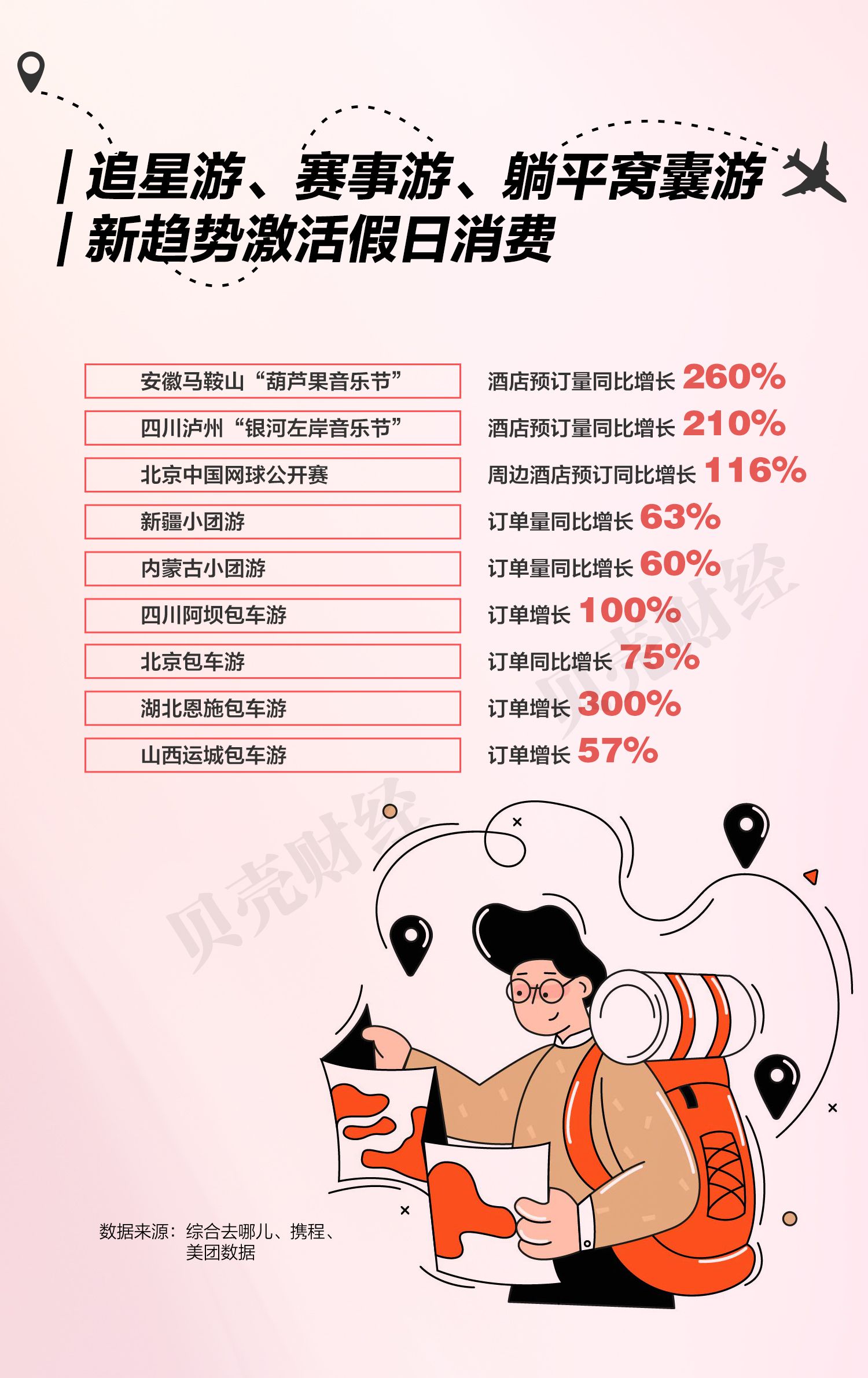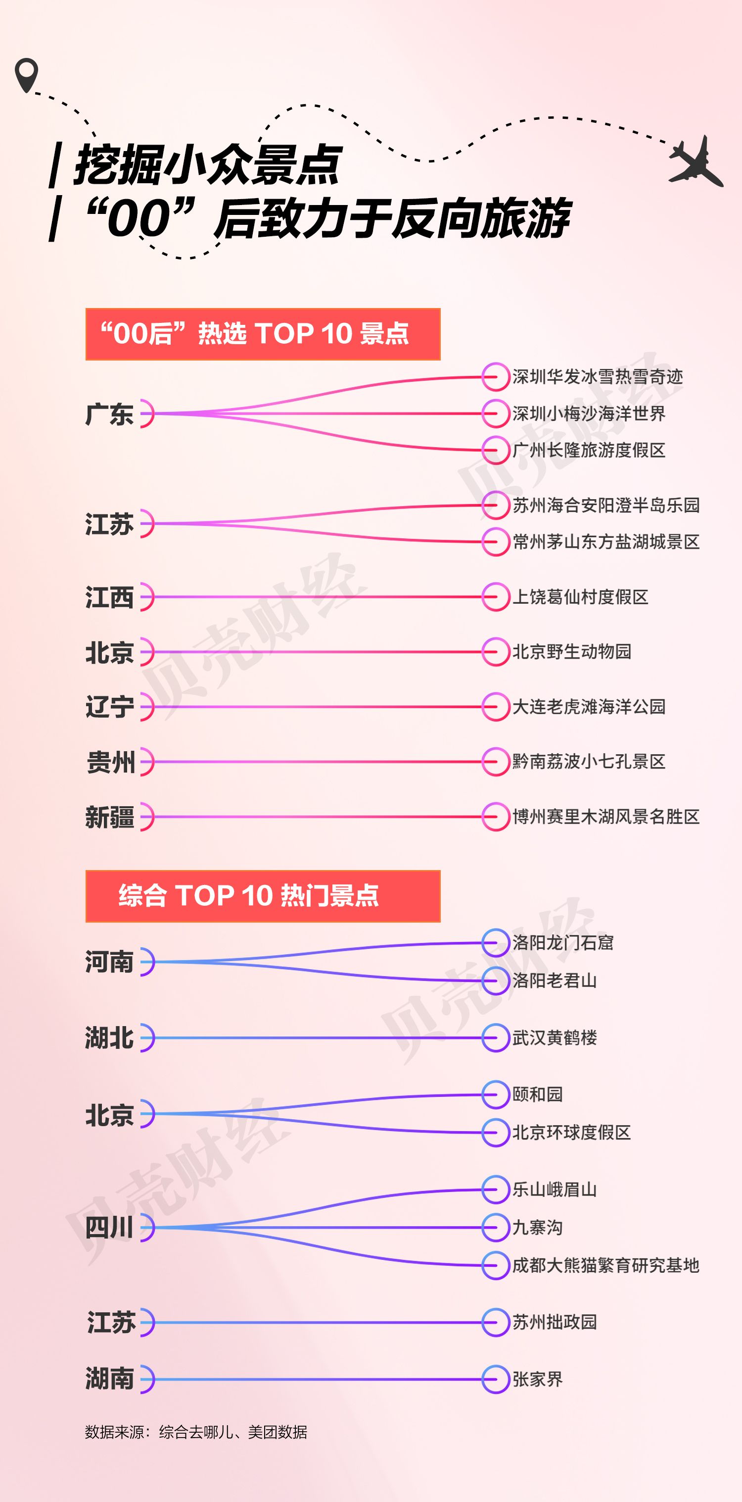不過,「反向旅遊」也出現了新的熱度分化:有人成功探索到真正冷門的寶藏景點,也有人不約而同地湧向人氣「黑馬」目的地,例如假期訂單量同比增長60%的景德鎮,以及登頂全國縣域酒店預訂量榜首的九寨溝縣。此外,相比於往年常見的「特種兵式」旅遊,這屆年青人開啟了省心省力的跟團遊、包車遊等躺平玩法,加上近年興起的追星遊、賽事遊,共同推動多地旅遊消費呈現強勁增長。