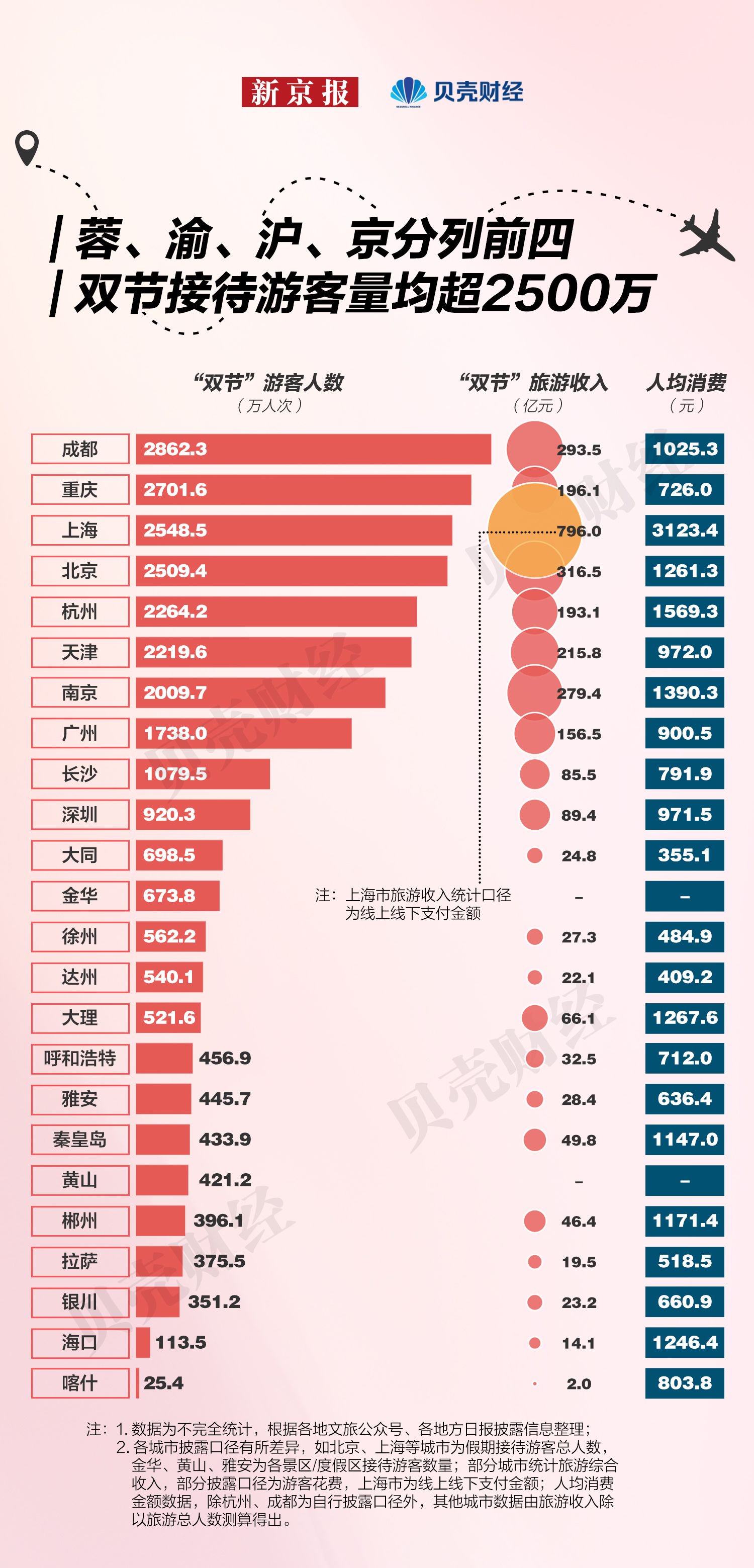 根據各地公開披露的旅遊數據,新京報貝殼財經記者製作了主要熱門城市的「雙節」成績單。其中,成都、重慶、上海、北京分列前四,接待遊客量均超2500萬人次。