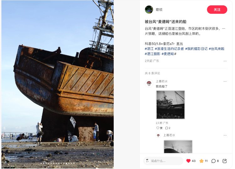 10月5日,今年第21號颱風「麥德姆」的中心以強颱風級別在廣東省湛江市徐聞縣東區沿希頓陸,登陸時中心附近最大風力14級(42米/秒,強颱風級)。颱風過後,當地不少網民發影片稱,調順島附近海邊擱淺了一艘輪船,並迅速成為網紅打卡點。不少網民調侃,颱風給湛江送來了湛江版「布魯威斯號」,要助力當地文旅起飛!」也有網民提醒,「打卡有風險,切勿靠得太近。」還有網民好奇這艘輪船的來曆以及後續的處理事宜。