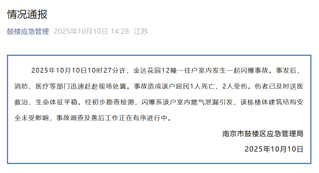 新京報訊 10月10日,南京市鼓樓區應急管理局發佈情況通報,2025年10月10日10時27分許,金達花園12幢一住戶室內發生一起閃爆事故。事發後,消防、醫療等部門迅速趕赴現場處置。事故造成該戶居民1人死亡,2人受傷。傷者已及時送醫救治,生命體徵平穩。經初步勘查檢測,閃爆系該戶室內燃氣泄漏引發,該棟樓體建築結構安全未受影響,事故調查及善後工作正在有序進行中。