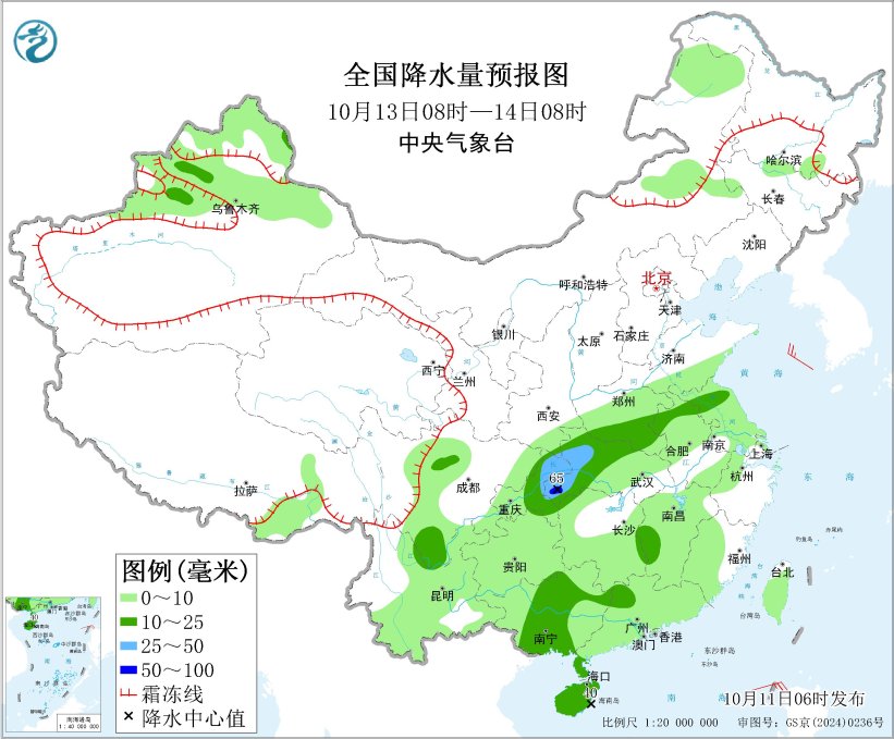 10月13日08時至14日08時,新疆西北部、河南南部、安徽北部、江蘇北部、湖北西岸、江西西岸、四川南部、重慶中東區、廣東西南部、廣西中部和東南部沿海、海南島等地部分地區有中到大雨,其中,湖北西南部等地部分地區有暴雨(50~65毫米)。新疆北部和東區、甘肅河西、內蒙古中部等地有4~6級風,其中,新疆山口風力有7~8級;黃海中部和南部海域將有4~6級風、陣風7級。