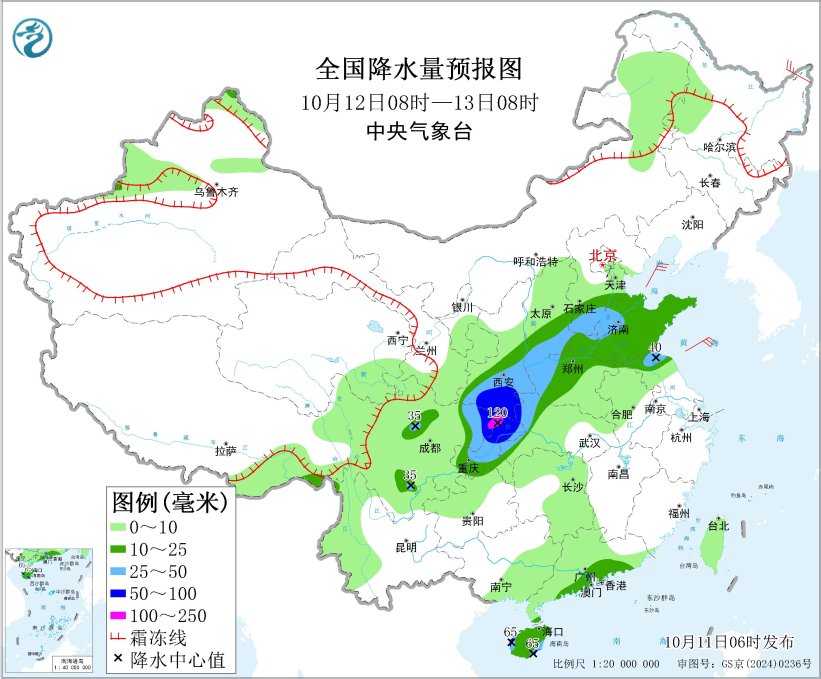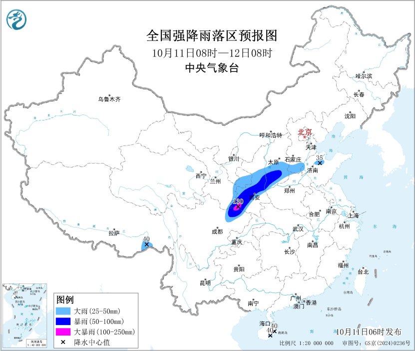 11日至13日,四川盆地、西北地區東區、華北南部、黃淮、江漢西岸等地部分地區有中到大雨,局地暴雨或大暴雨。其中,10月11日08時至12日08時,四川盆地西北部、甘肅東區、陝西中部和南部、山西中南部、河北南部、山東北部及海南島東區、西藏東南部等地部分地區有大到暴雨,其中,陝西南部、四川盆地西北部等地局地有大暴雨(100~130毫米)。上述部分地區伴有短時強降水(最大小時降雨量20~30毫米,局地可超過40毫米),局地有雷暴大風等強對流天氣。中央氣象台10月11日06時繼續發佈暴雨藍色預警。