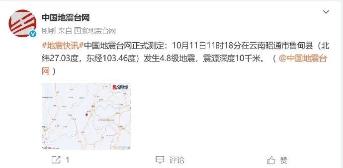 #雲南昭通4.8級地震#【願平安!#雲南昭通魯甸縣4.8級地震#】中國地震台網正式測定:10月11日11時18分在雲南昭通市魯甸縣(北緯27.03度,東經103.46度)發生4.8級地震,震源深度10千米。(新華社,中國地震台網 )