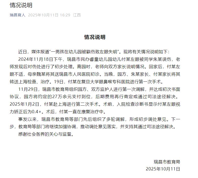 11月29日,瑞昌市教育局組織園方、雙方監護人進行第一次調解,並達成初次書面協議,園方將約定的27萬餘元支付到位,後期費用再行商定或通過司法途徑解決。2025年1月2日,付某赴上海進行第二次手術。術前,入院檢查診斷書顯示付某左眼視力矯正後為0.4+。術後,付某一直在康復治療中。