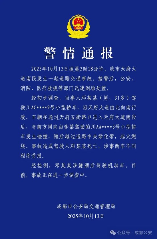 中國新聞 成都交警通報:酒駕事故,致1人死亡 10月13日 15:22 新浪網 news-china-auto-hilite 來源:成都公安 2025年10月13日,成都市公安局交通管理局發佈警情通報: 此前報導: 成都一輛小米SU7超速失控自燃:路人施救未果,原因在調查中