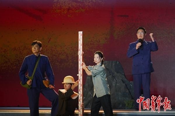 10月12日晚,南京,2025「把青春華章寫在祖國大地上」大思政課網絡主題宣傳和互動引導活動現場,演員林永健(右一)在舞台演繹紅旗渠工程設計師吳祖太的故事。中青報·中青網記者 田嘉碩/攝