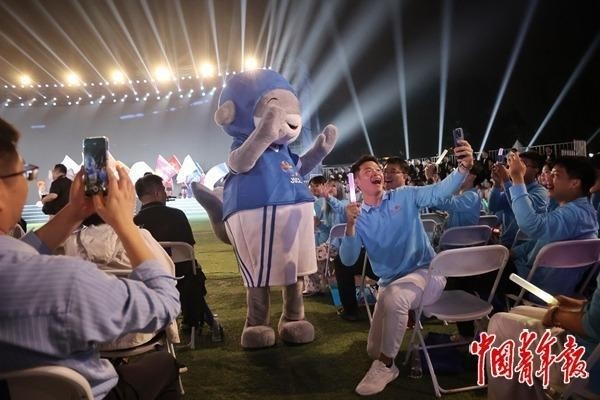 10月12日晚,南京,2025「把青春華章寫在祖國大地上」大思政課網絡主題宣傳和互動引導活動現場,「蘇超」吉祥物豚寶和現場師生互動。中青報·中青網記者 王鑫昕/攝
