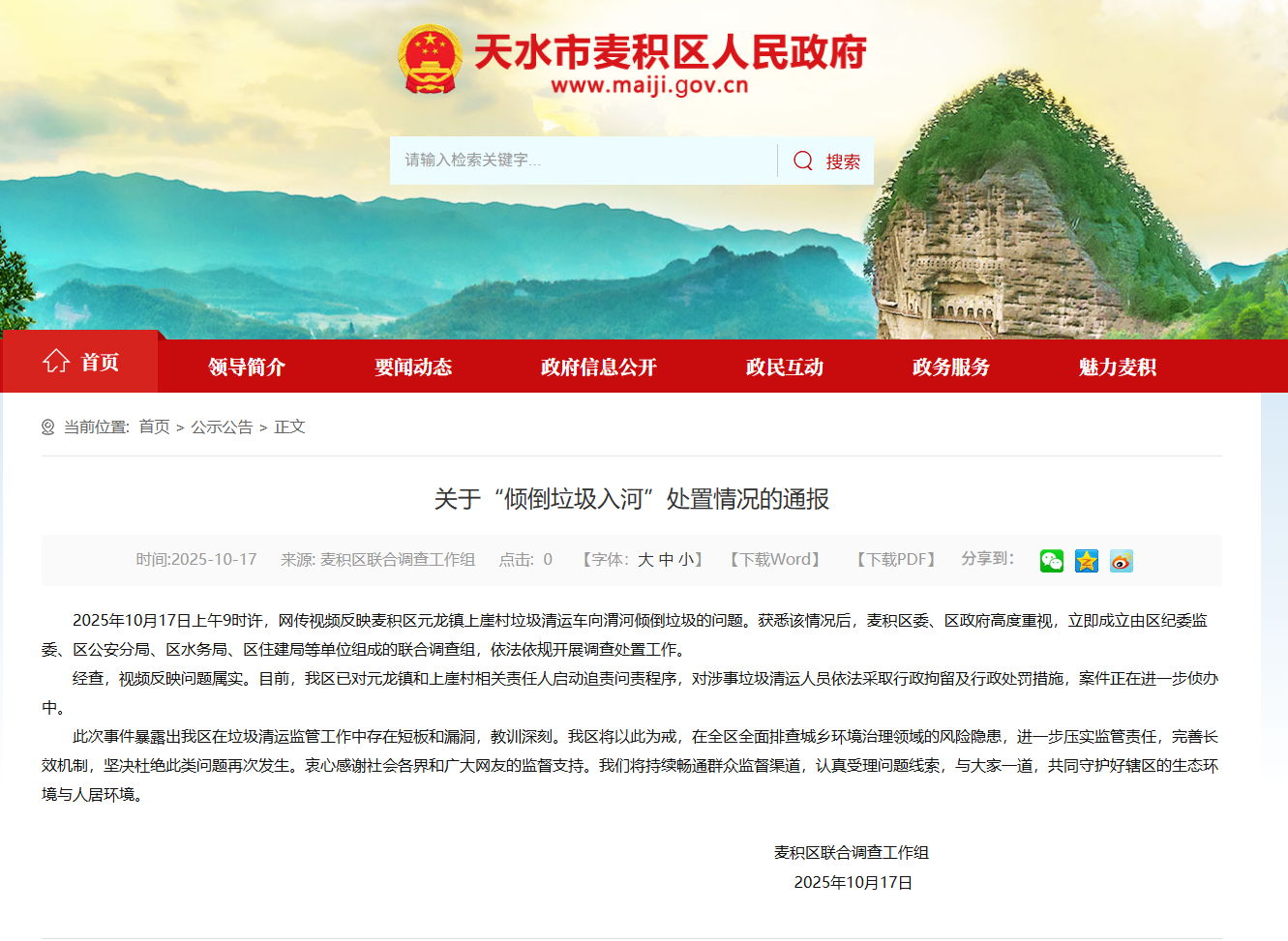 2025年10月17日上午9時許,網傳影片反映麥積區元龍鎮上崖村垃圾清運車向渭河傾倒垃圾的問題。獲悉該情況後,麥積區委、區政府高度重視,立即成立由區紀委監委、區公安分局、區水務局、區住建局等單位組成的聯合調查組,依法依規開展調查處置工作。