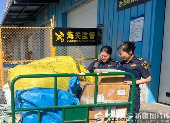 7月25日,烏魯木齊天山機場海關關員對國際郵袋進行監管。高俊 攝