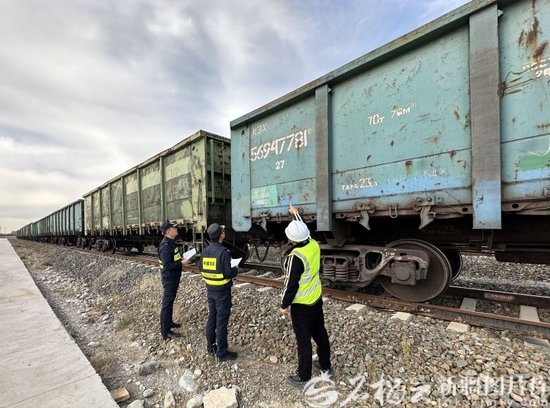 2024年12月5日,霍爾果斯國際邊境合作中心海關關員在霍爾果斯綜保區內驗放通過鐵路專用線運輸的出口鋼材。鄭浩 攝