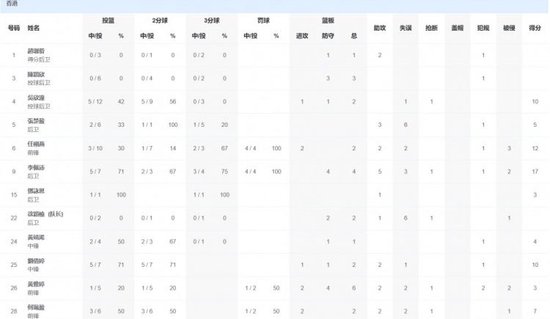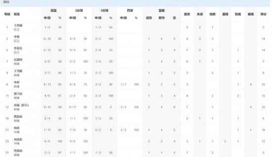 四川隊方面,李夢25分4籃板3助攻,韓旭16分5籃板,高頌23分6籃板7助攻,王思雨3分3助攻1偷球。