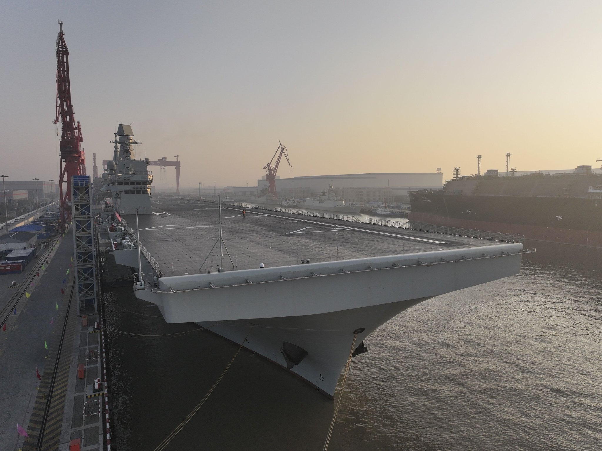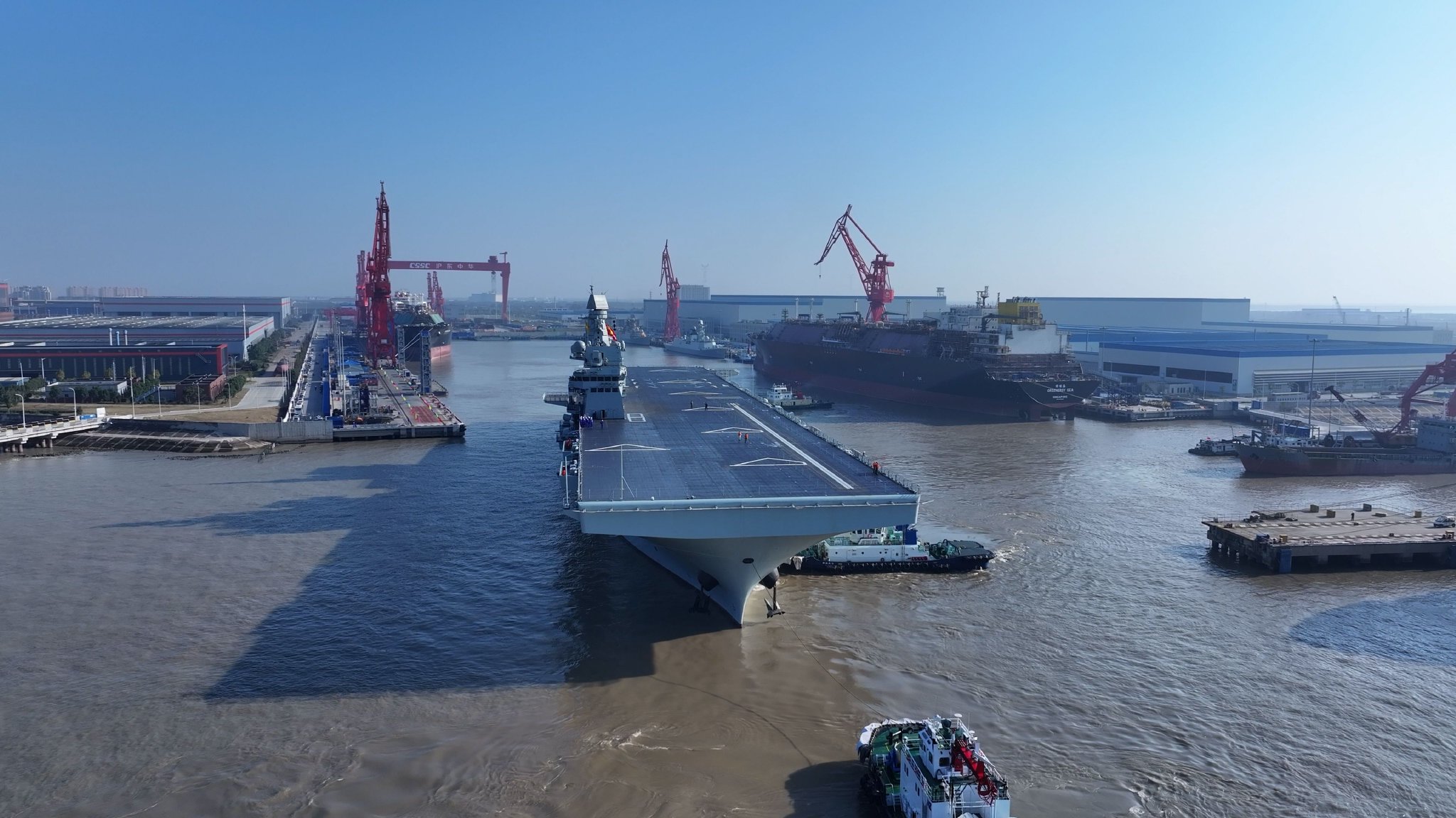 據@新華社 消息,11月14日9時許,我國076兩棲攻擊艦首艦四川艦從上海滬東中華造船廠碼頭解纜啟航,赴相關海域開展首次航行試驗任務。