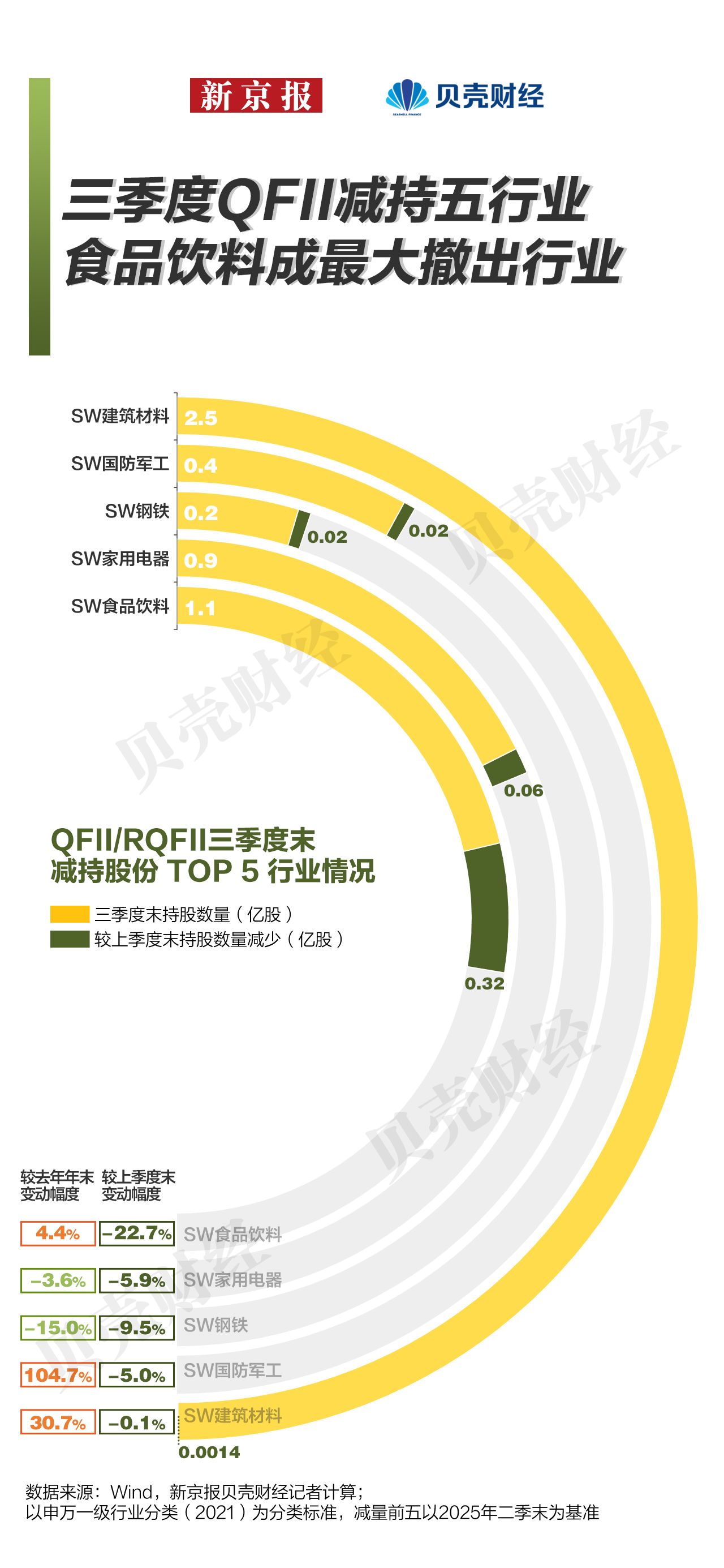 此外,三季度,QFII/RQFII僅對五個行業進行了減持。其中,食品飲料成為減持數量最大的行業,較二季度末持倉數量下降22.7%。家用電器和鋼鐵行業分列其後,持倉較二季度末分別減少558萬股和245萬股。家電板塊部分龍頭企業前期股價表現強勢,QFII/RQFII或選擇階段性減倉獲利;鋼鐵板塊則受週期性需求波動影響。