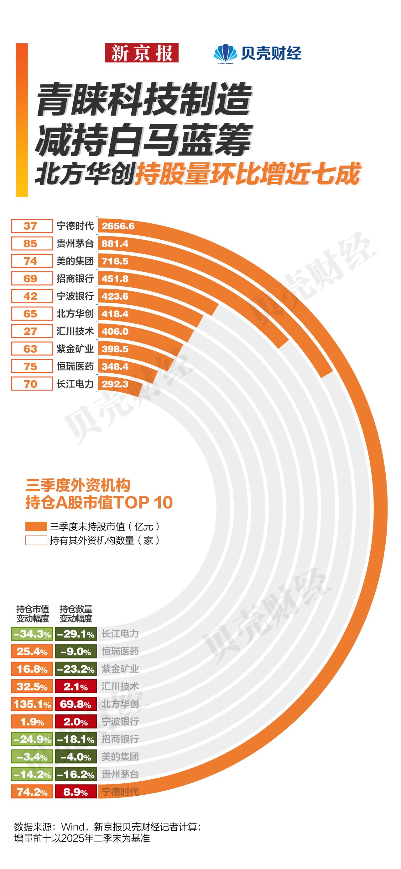 從持股市值來看,外資持有寧德時代6.6億股,三季度末市值為2656.59億元,遠超其餘持有個股的市值。與二季度末相比,外資持有寧德時代股票數增長8.9%,市值增幅達74.2%。北方華創表現同樣亮眼,外資持股數量環比增長近70%,市值上升135%,成為外資持有前十大市值個股中加倉力度最大的科技股。