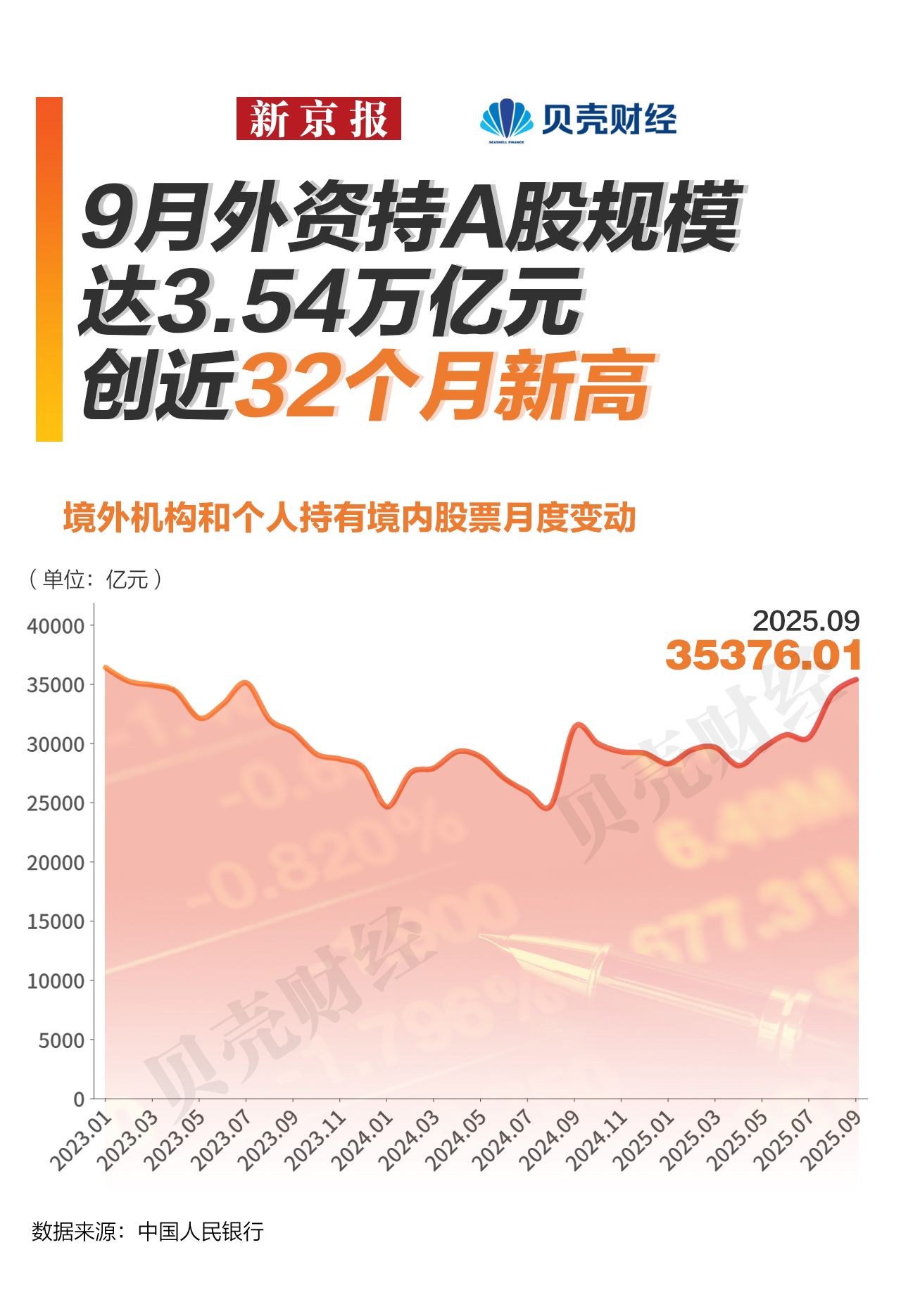 這並非外資持股的全部資金。根據央行披露數據,今年9月末境外機構和個人持有境內股票3.54萬億元,連續四個月站上3萬億元,創下近32個月新高,外資整體加配A股趨勢明顯。