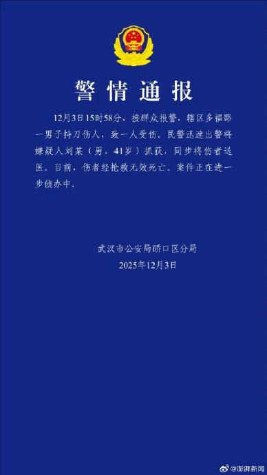 中國新聞 武漢警方通報一男子持刀傷人:致1人死亡,已被抓獲 12月03日 21:45 新浪網 news-china-auto-hilite 【#武漢警方通報一男子持刀傷人#:致1人死亡,已被抓獲】#武漢一男子持刀傷人致1人死亡#↓