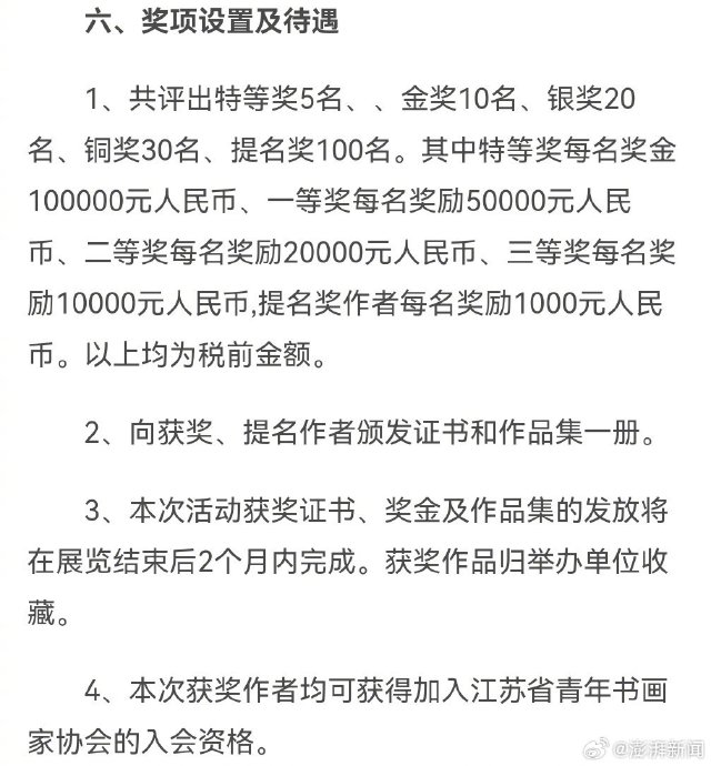 此外,在獎項設置及待遇方面,徵稿啟事提到,該賽事共評出特等獎5名、金獎10名、銀獎20名、銅獎30名、提名獎100名。其中特等獎每名獎金100000元人民幣、一等獎每名獎勵50000元人民幣、二等獎每名獎勵20000元人民幣、三等獎每名獎勵10000元人民幣,提名獎作者每名獎勵1000元人民幣。以上均為稅前金額。本次獲獎作者均可獲得加入江蘇省青年書畫家協會的入會資格。