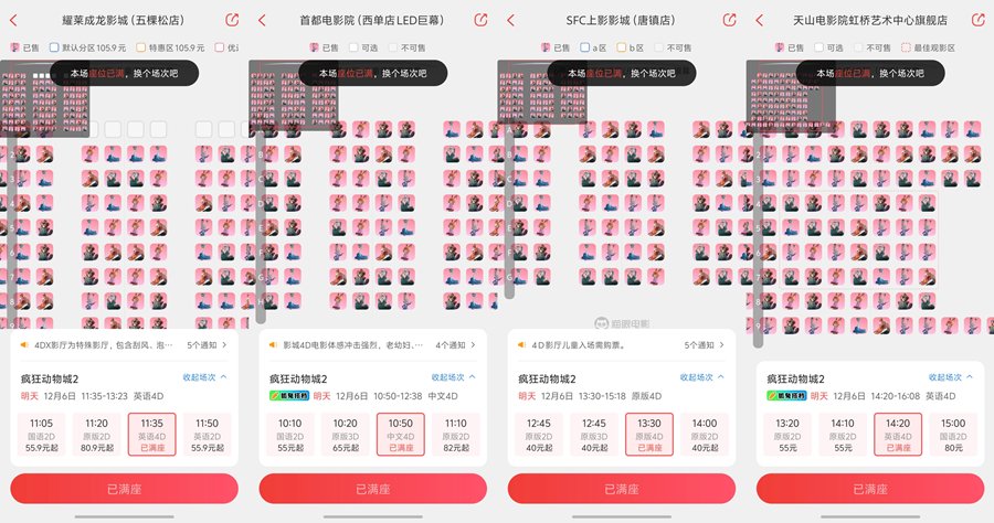 12月6日,北京、上海多家影城《瘋狂動物城2》4D廳顯示滿座。