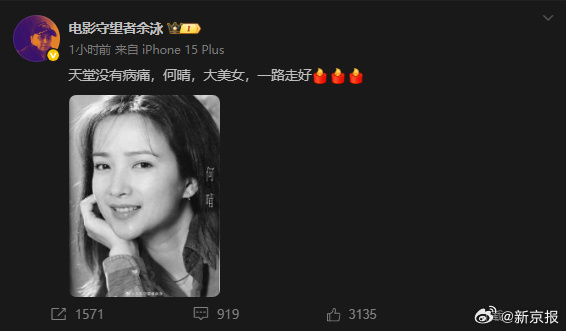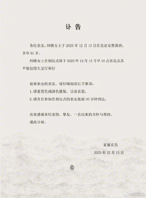 【#演遍了四大名著的何晴去世#】據揚子晚報消息,12月13日,一份家屬發佈訃告顯示,著名演員何晴在北京安然離世,享年61歲。告別儀式將於2025年12月15號早10點在北京昌平殯儀館久安廳舉行。「電影守望者餘泳」向記者證實了這一消息,他於社交平台發佈何晴的黑白肖像照,並配文「天堂沒有病痛,何晴,大美女,一路走好」,引發網民與演藝圈人士的集體緬懷。餘泳透露,何晴生病後一直希望低調,讓大家永遠記住她美好的形象。