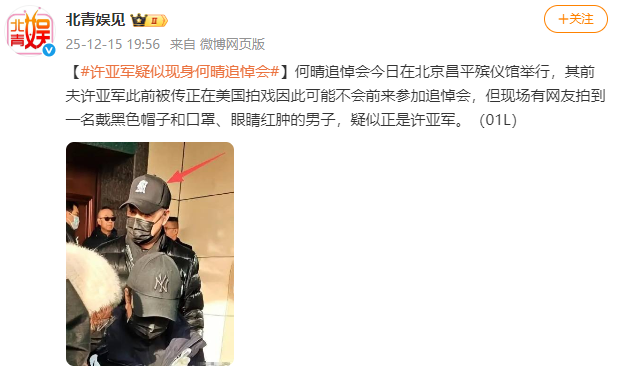 中國新聞 許亞軍疑似現身何晴追悼會 12月15日 20:00 新浪網 news-china-auto-hilite 來源:北青娛見 [許亞軍疑似現身何晴追悼會]何晴追悼會今日在北京昌平殯儀館舉行,其前夫許亞軍此前被傳正在美國拍戲因此可能不會前來參加追悼會,但現場有網民拍到一名戴黑色帽子和口罩、眼睛紅腫的男子,疑似正是許亞軍。
