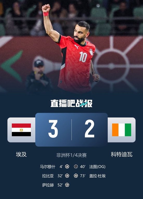 香港時間1月11日訊 香港時間1月11日03:00,非洲盃8強戰埃及迎戰科特迪瓦的比賽在阿迪拉維杜華爾球場進行,上半場馬爾穆什單刀閃擊首開記錄,沙拿助攻拉比亞頭槌擴大比數,法圖門前自擺烏龍,下半場阿舒爾助攻沙拿推射破門,杜埃補射建功,最終埃及3-2科特迪瓦進四強將戰塞內加爾。