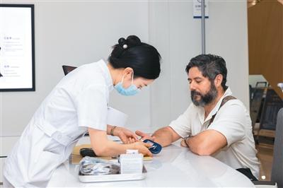 2025年5月14日,外國體驗者在湖南省長沙市三諾健康糖尿病門診體驗慢病多指標快速檢測。