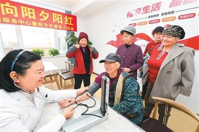 2025年10月29日,在黑龍江省哈爾濱市向陽鎮的幸福養老服務中心,醫務人員在幫老年人檢測血壓。