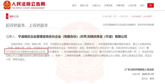人民法院公告網顯示,深圳市福田區人民法院1月7日刊登了劉曉慶的上訴狀,上訴請求之一為依法改判駁回被上訴人王先生的全部訴訟請求或發回重審。