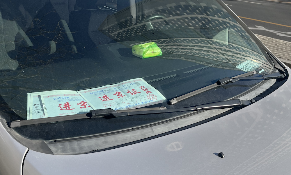 「無牌」非法運營車輛擋風玻璃上臨時牌照和進京證的倒影。