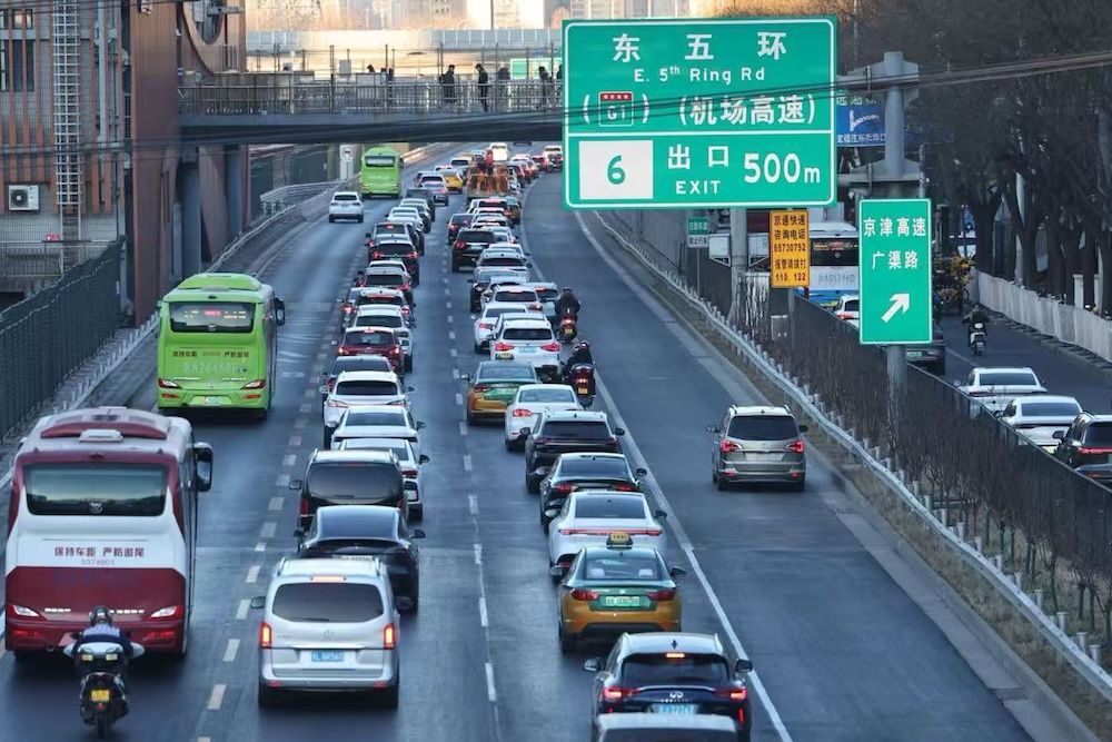 1月5日上午,京通快速路進京方向車行緩慢,而「無牌」非法運營車輛直接駛入應急車道。