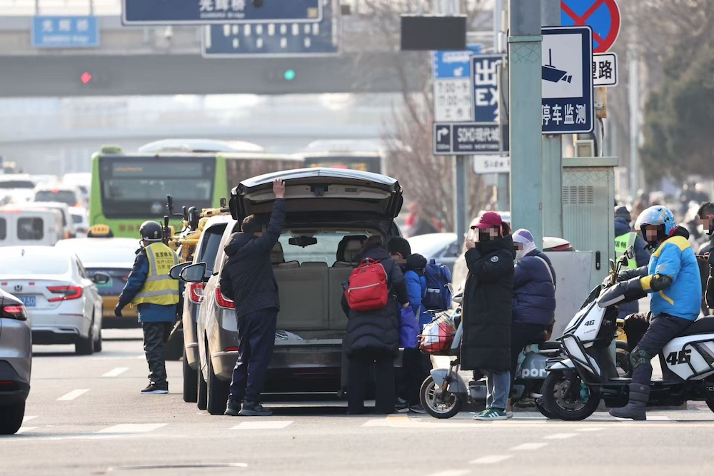 「燕郊燕郊,30元一位啦!我們是‘快車’!」一群黑衣人站在西大望路的路牌下,不停向路人反復吆喝。據相關報導,這些所謂的「快車」長期盤踞在國貿、大望路一帶。