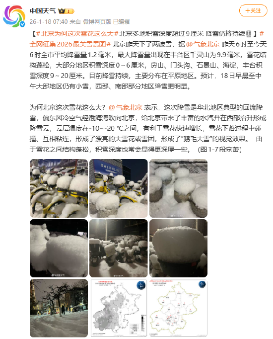 [北京為何這次雪花這麼大 北京多地積雪深度超過9釐米 降雪仍將持續]北京昨天下了兩波雪,據@氣象北京 昨天6時至今天6時全市平均降雪量1.2毫米,最大降雪量出現在豐台區千靈山為9.9毫米。雪花結構蓬鬆,大部分地區積雪深度0~6釐米,房山、門頭溝、石景山、海澱、豐台積雪深度9~20釐米。目前降雪持續,主要分佈在平原地區。預計,18日早晨至中午大部地區仍有小雪,西岸、南部部分地區降雪更明顯。為何北京這次雪花這麼大?@氣象北京 表示,這次降雪是華北地區典型的回流降雪,偏東風冷空氣經渤海灣吹向北京,給北京帶來了豐富的水汽並在西岸抬升形成降雪雲,雲層溫度在-10~-20 ℃之間,有利於雪花快速增長,雪花下落過程中碰撞、互相粘連,形成了漂亮的大雪花或雪團,形成了「鵝毛大雪」的視覺效果。 由於雪花之間結構蓬鬆,積雪深度也常會顯得更深厚一些。(圖1-7段京蕾)