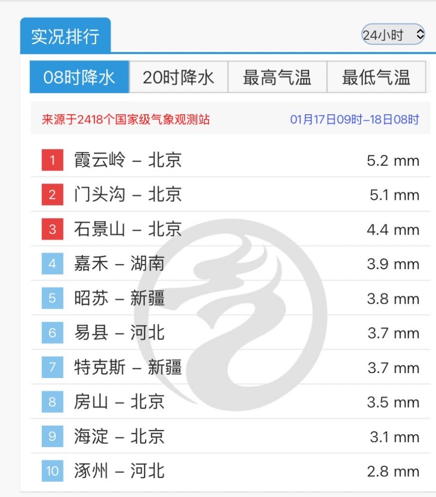 新京報訊(記者王景曦)根據國家級氣象觀測站數據,過去24小時中(1月17日9:00至1月18日8:00),北京霞雲嶺、門頭溝、石景山的國家級氣象站監測到的降雪量在全國排名前三。