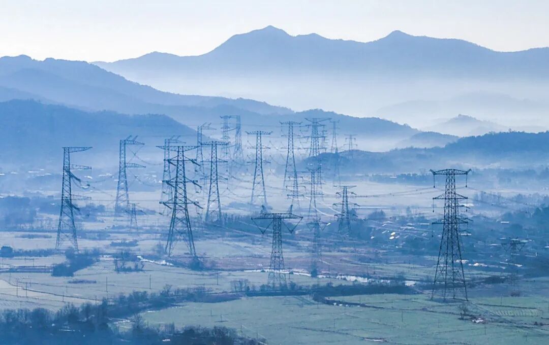 安徽省蕪湖市繁昌區孫村鎮,「西電東送」特高壓通道工程與晨霧、山巒、鄉村等相映成景。魯君元攝(影像中國)