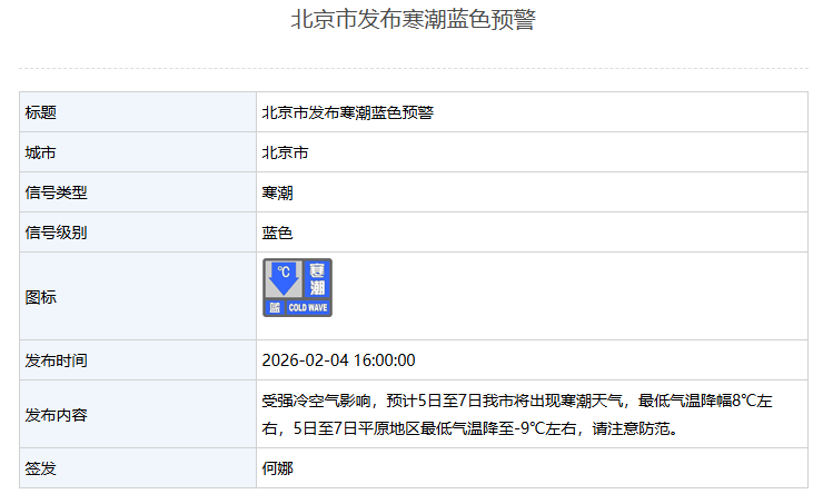 中國新聞 最低氣溫降幅8℃左右!北京市發佈寒潮藍色預警 02月04日 16:01 新浪網 news-china-auto-hilite 新京報訊 據北京市氣象局消息,北京市發佈寒潮藍色預警。 受強冷空氣影響,預計5日至7日北京市將出現寒潮天氣,最低氣溫降幅8℃左右,5日至7日平原地區最低氣溫降至-9℃左右,請注意防範。 編輯 李憶林子