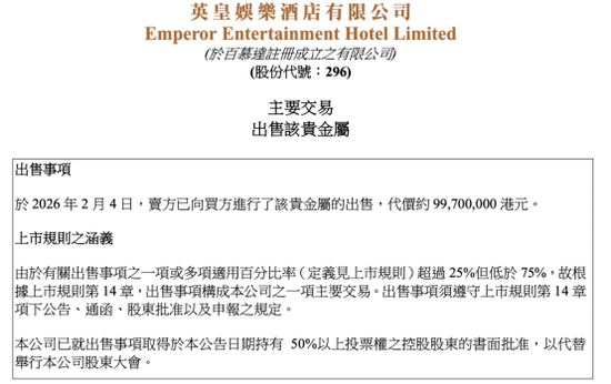 「鑒於當前的市場狀況以及該貴金屬的市場價格目前處於高位水平,董事認為出售事項對公司而言是一個實現和釋放該貴金屬價值的良好機會,同時使公司未來能夠節省與該貴金屬相關的保安及保險費用。」英皇娛樂酒店表示。