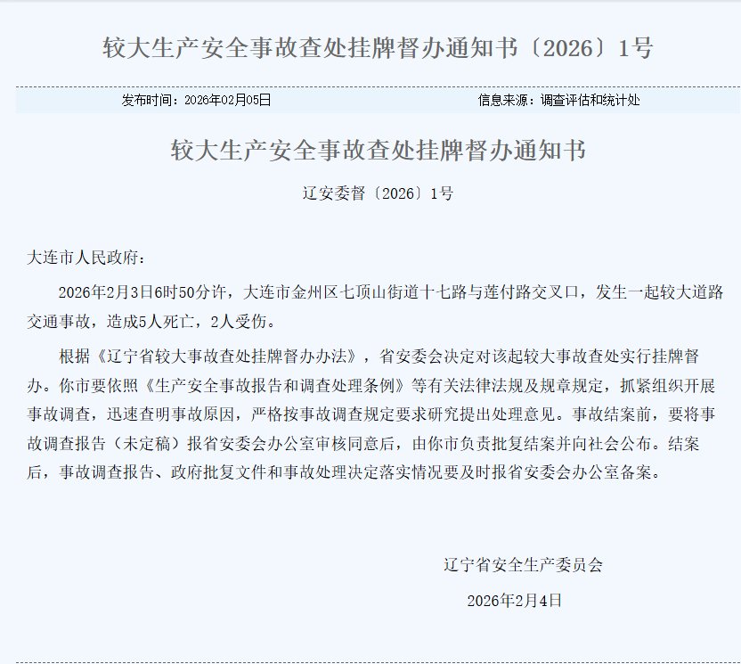 2026年2月3日6時50分許,大連市金州區七頂山街道十七路與蓮付路交叉口,發生一起較大道路交通事故,造成5人死亡,2人受傷。