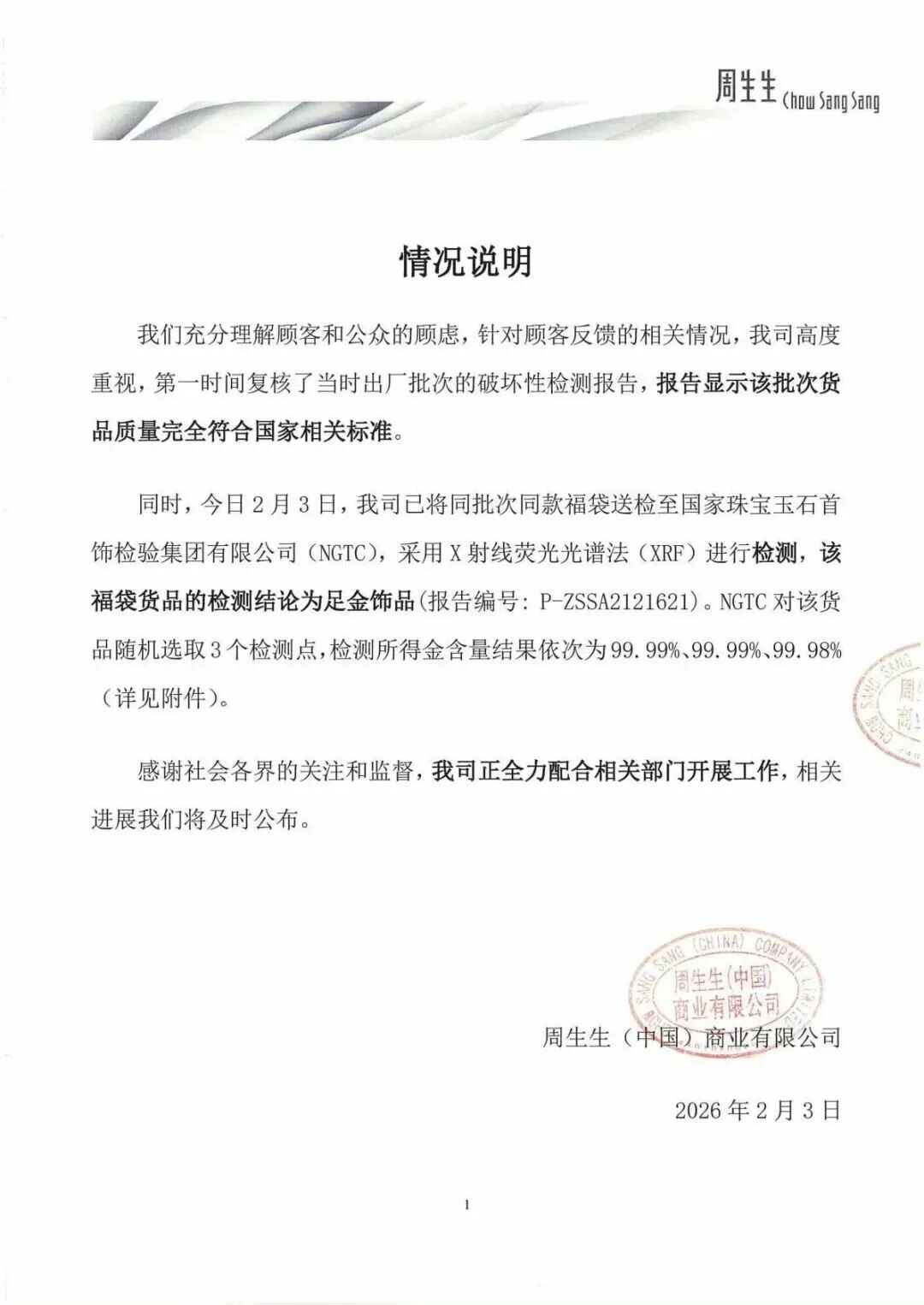 2月3日,周生生公佈該批次福袋掛墜的檢測報告,稱該批次貨品質量完全符合國家相關標準,該批次同款福袋檢測為足金。