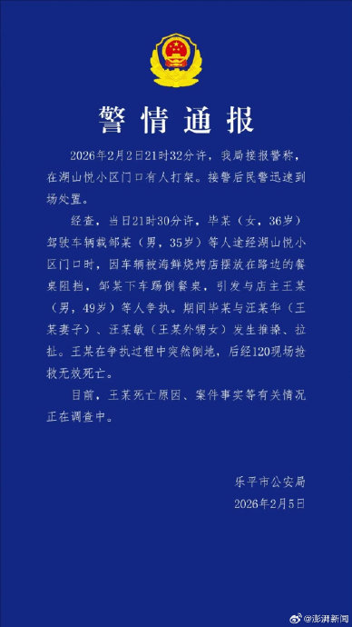 【#警方通報燒烤店主與人衝突時死亡#:死因正調查】#燒烤店主與人衝突死亡死因正調查#2月5日,江西省樂平市公安局發佈警情通報:2026年2月2日21時32分許,我局接報警稱,在湖山悅小區門口有人打架。接警後民警迅速到場處置。