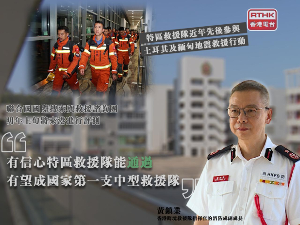 特區救援隊近年參與多項救援行動,身兼香港跨境救援隊指揮官的消防處副處長黃鎮業表示,特區救援隊能力不斷進步,有信心明年能順利通過聯合國組織評測,成為國家第一支中型救援隊。
