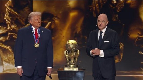 香港時間12月6日訊 在2026美加墨世界盃的抽籤儀式上,國際足協正式宣佈,向79歲的美國總統特朗普頒發首屆國際足協和平獎,國際足協主席恩芬天奴現場為特朗普頒獎。