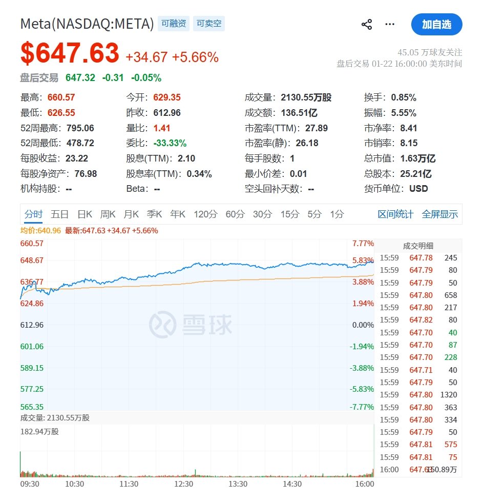 【#特斯拉漲4.15%##Meta大漲超5%#】美東時間1月22日,美股三大指數收盤集體上漲,道指漲0.63%,納指漲0.91%,標普500指數漲0.55%。科技股普漲,Meta收漲5.7%,創7月31日以來最大單日漲幅;甲骨文漲超2%,AMD、微軟、亞馬遜漲超1%。馬斯克稱在美國得州的無人駕駛出租車RoboTaxi取消安全監督員,特斯拉漲超4%,Lyft跌1.5%,Uber跌2%。(財聯社)#阿里大漲超5%#