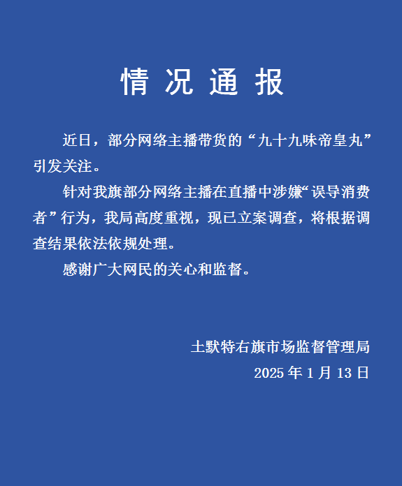 新京報訊 據土右市場監管官微消息,近日,部分網絡主播帶貨的「九十九味帝皇丸」引發關注。