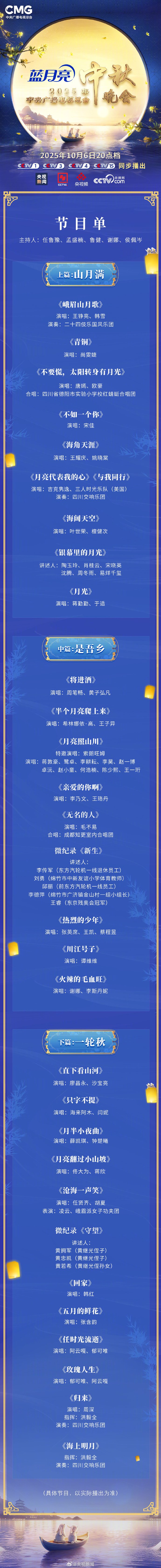 【轉存!#央視秋晚節目單來了#】山海共明月,此心是吾鄉。央視秋晚節目單出爐↓↓你最期待哪個節目?今晚20點,與@卡布叻_周深 @黃子弘凡_Lars @MIC檀健次JC-T @TFBOYS-易烊千璽 @於適Yosh @王子異 @希林娜依高 @歐豪 @唐嫣 @阿雲嘎Musical @胡夏 @十個勤天 (@種地吧蔣敦豪 @種地吧鷺卓 @種地吧李耕耘 @種地吧李昊 @種地吧趙一博 @種地吧卓沅 @種地吧趙小童 @種地吧何浩楠 @種地吧陳少熙 @種地吧王一珩 )等一起賞月過中秋! (新華社)