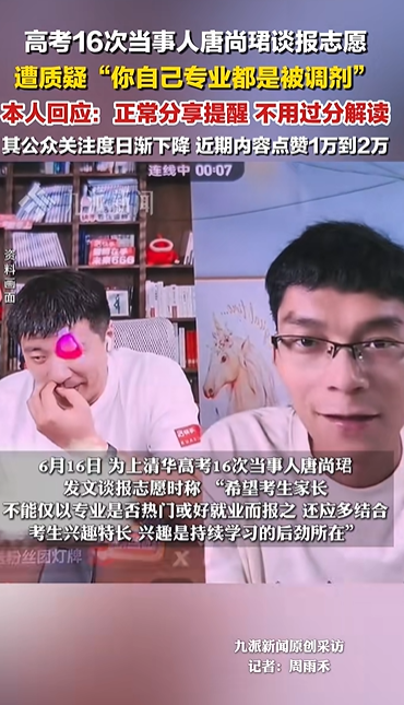 6月16日,為上清華高考16次當事人唐尚珺發文談報誌願時稱,「希望考生家長不能僅以專業是否熱門或者好就業而報之,還應該多多結合考生興趣特長,畢竟興趣是持續學習的後勁所在。」評論區有人指出其專業都是被調劑,質疑其沒資格指導別人。