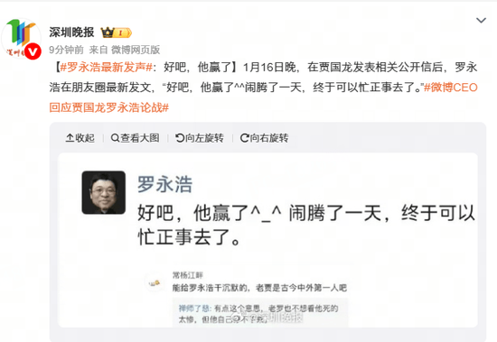 1月16日晚,在賈國龍發表相關公開信後,羅永浩在朋友圈最新發文,「好吧,他贏了^^鬧騰了一天,終於可以忙正事去了。」