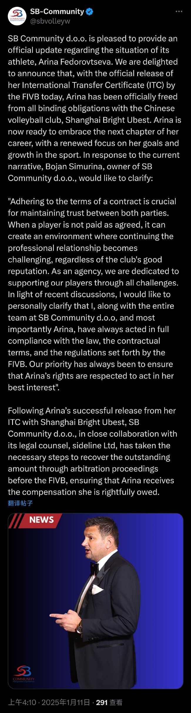 「遵守合約條款對維持雙方之間的信任至關重要。如果球員未能按照合約約定獲得支付,無論球會的聲譽如何,都可能會創造一個阻礙職業關係繼續的環境。作為一家經紀公司,我們堅定支持我們的球員,幫助他們應對各種挑戰。針對近期的爭議,我想親自聲明,我、SB Community d.o.o。團隊以及最重要的阿麗娜,始終嚴格遵守法律、合約條款以及國際排聯製定的相關規定。我們的首要任務始終是保護阿麗娜的權益,並盡最大努力保障她的利益。