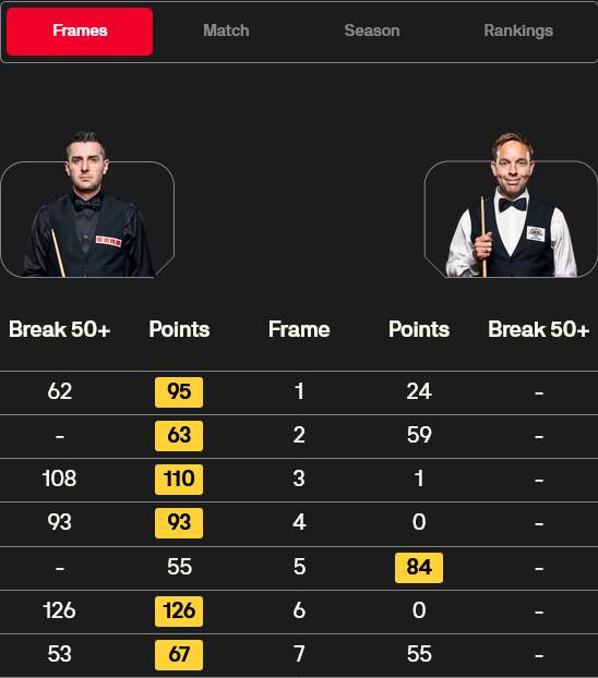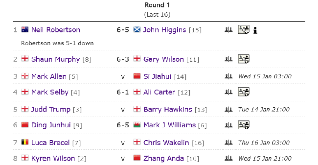 在第二日首場比賽中,9號種子丁俊暉憑藉6杆60+,在挽救1個賽點後,大比數6-5逆轉打出2杆50+和1杆破百的6號種子馬克·威廉斯,時隔6年再進賽會八強。(相關閱讀:大師賽次日丁俊暉6杆50+救賽點 6-5逆轉馬叔進8強)
