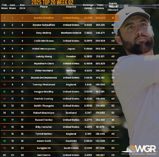 世界前十變化幅度小,僅僅是布賴森-迪甘斯博與湯米-弗利特伍德(Tommy Fleetwood)互換座次,布賴森-迪甘斯博上升到第九位,湯米-弗利特伍德下降到第十位,以下是新一期排序: