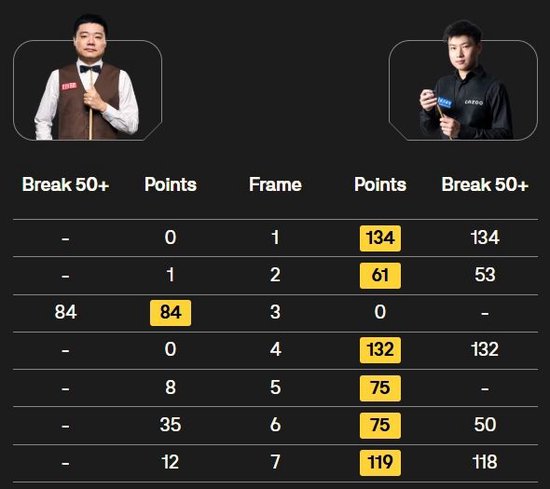 趙心童全場打出三杆破百(134、132、118)和兩杆50+(53、50),丁俊暉在第三局打出單杆84分。
